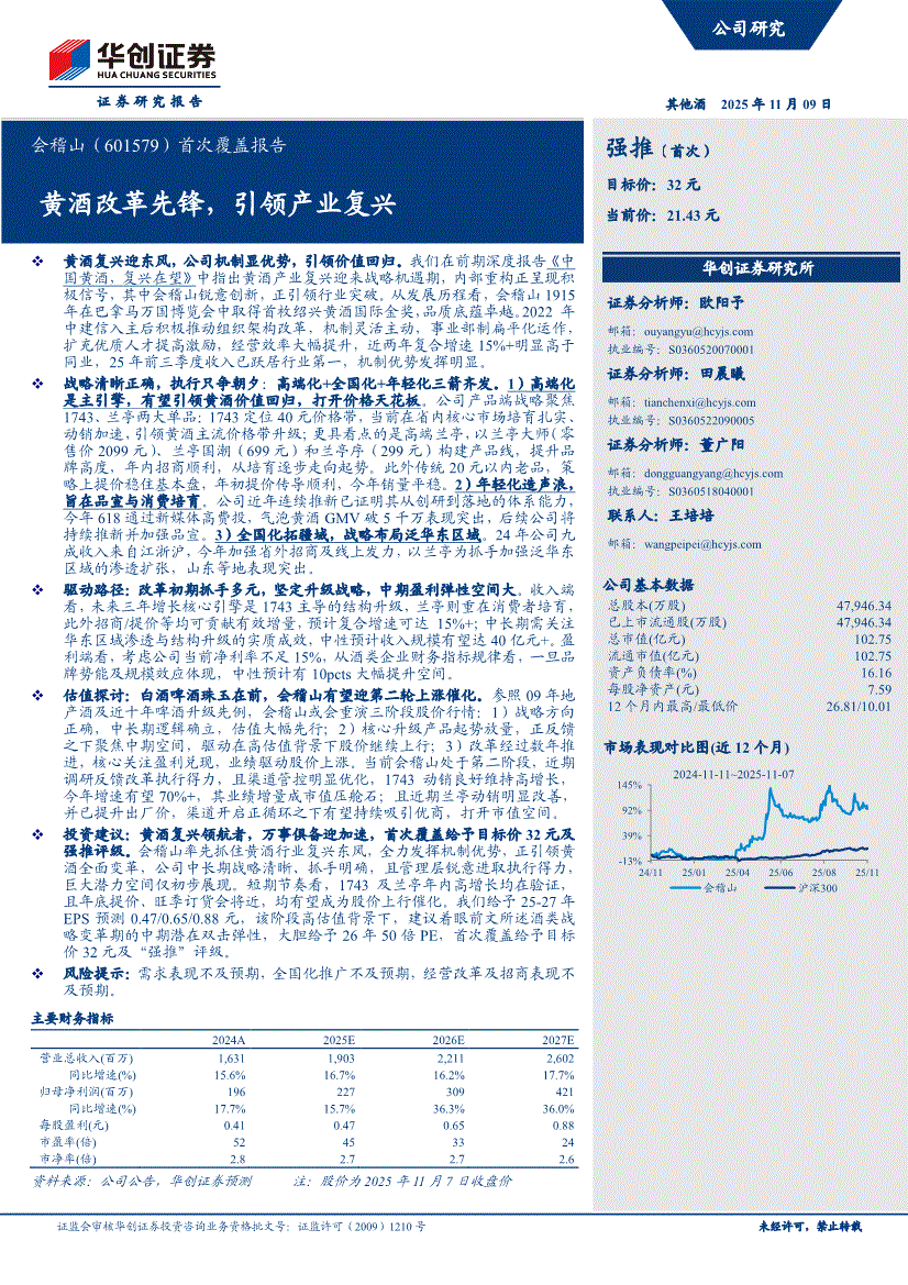 会稽山:华创证券-会稽山-601579-首次覆盖报告:黄酒改革先锋,引领产业复兴-251109
