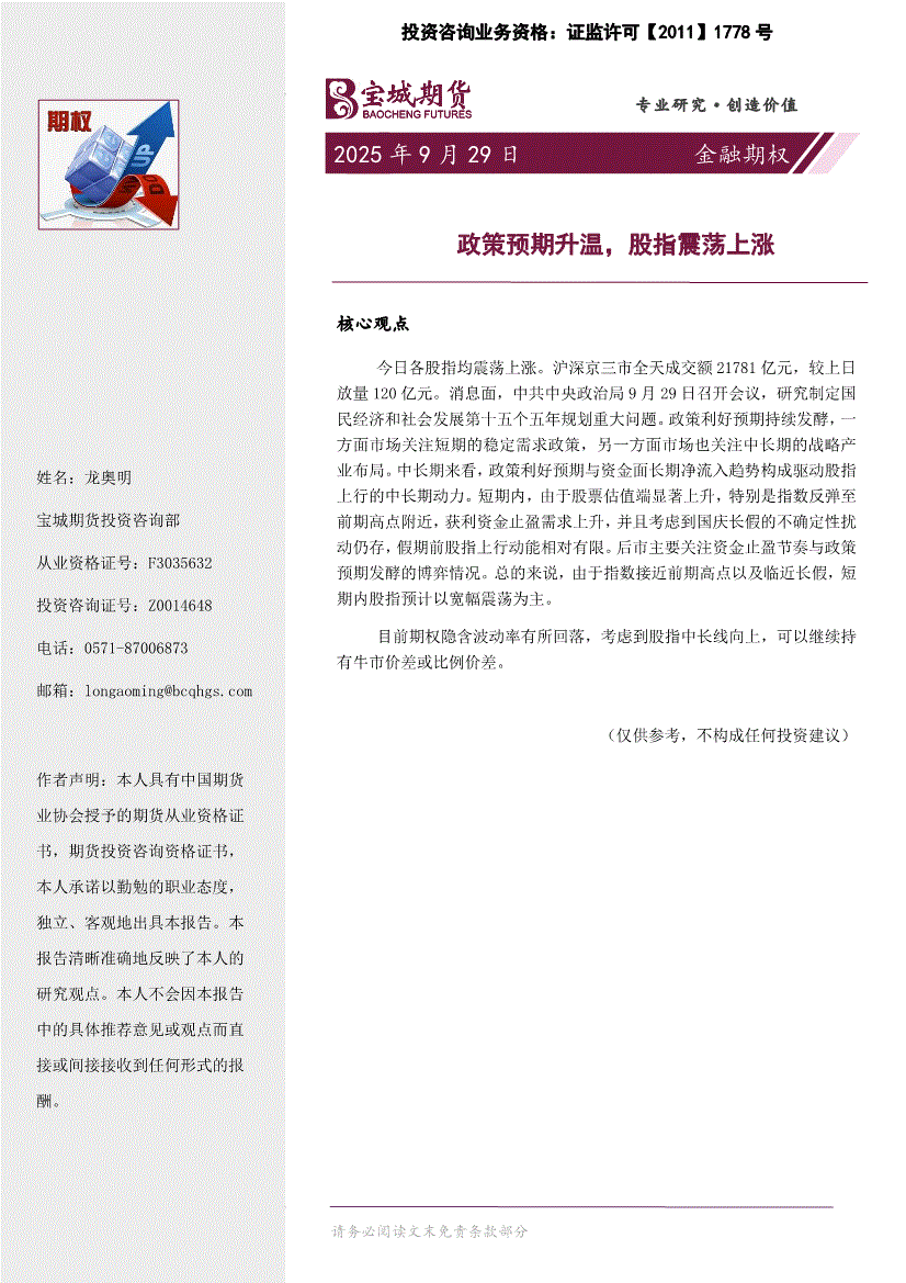 宝城期货-金融期权日报:政策预期升温,股指震荡上涨-250929