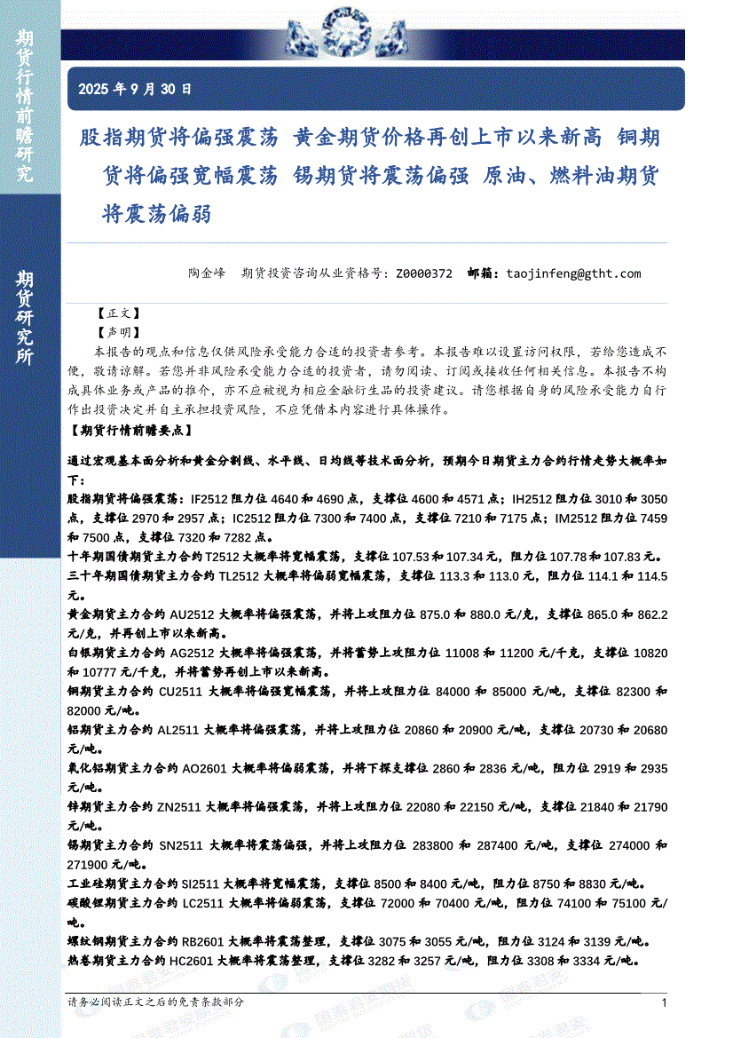 国泰君安期货-股指期货将偏强震荡,黄金期货价格再创上市以来新高,铜期货将偏强宽幅震荡 锡期货将震荡偏强,原油、燃料油期货将震荡偏弱-250930