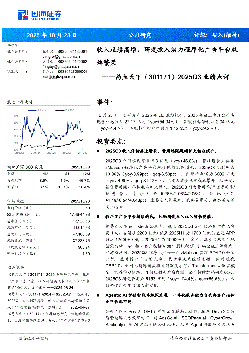 易点天下:国海证券-易点天下-301171-2025Q3业绩点评:收入延续高增,研发投入助力程序化广告平台双端繁荣-251028