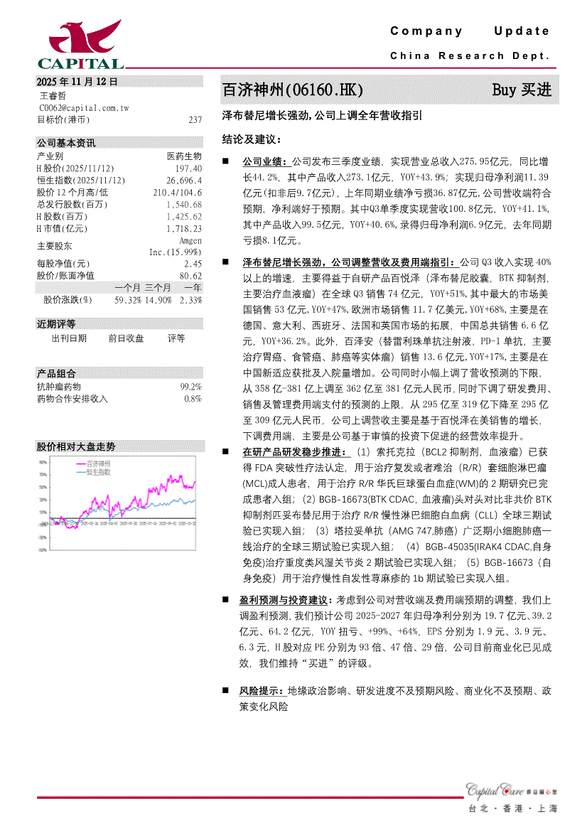 百济神州:群益证券-百济神州-6160.HK-泽布替尼增长强劲,公司上调全年营收指引-251112