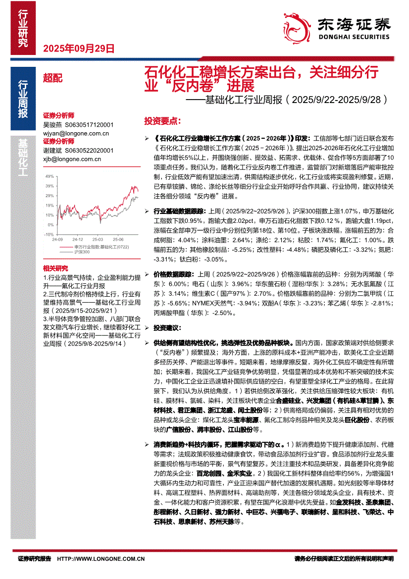 基础化工行业:东海证券-基础化工行业周报:石化化工稳增长方案出台,关注细分行业“反内卷”进展-250929