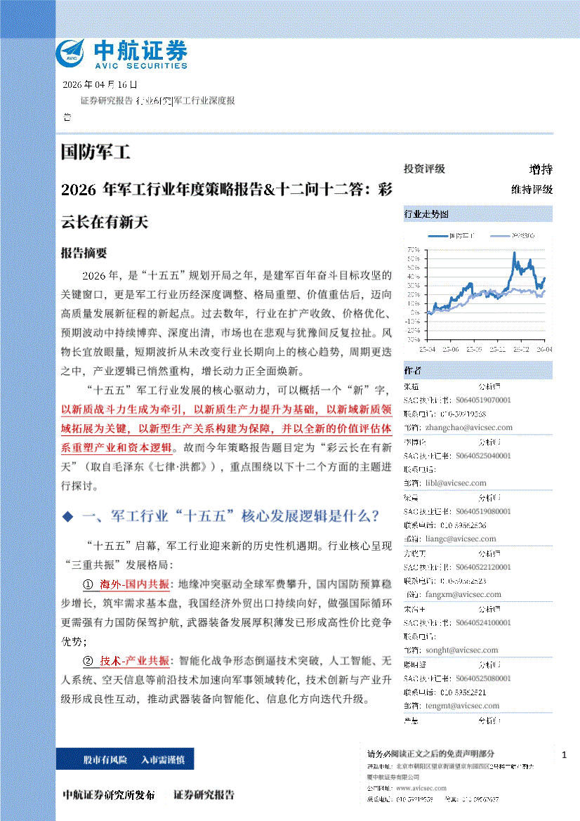 军工行业:中航证券-2026年军工行业年度策略报告&十二问十二答:彩云长在有新天-260416