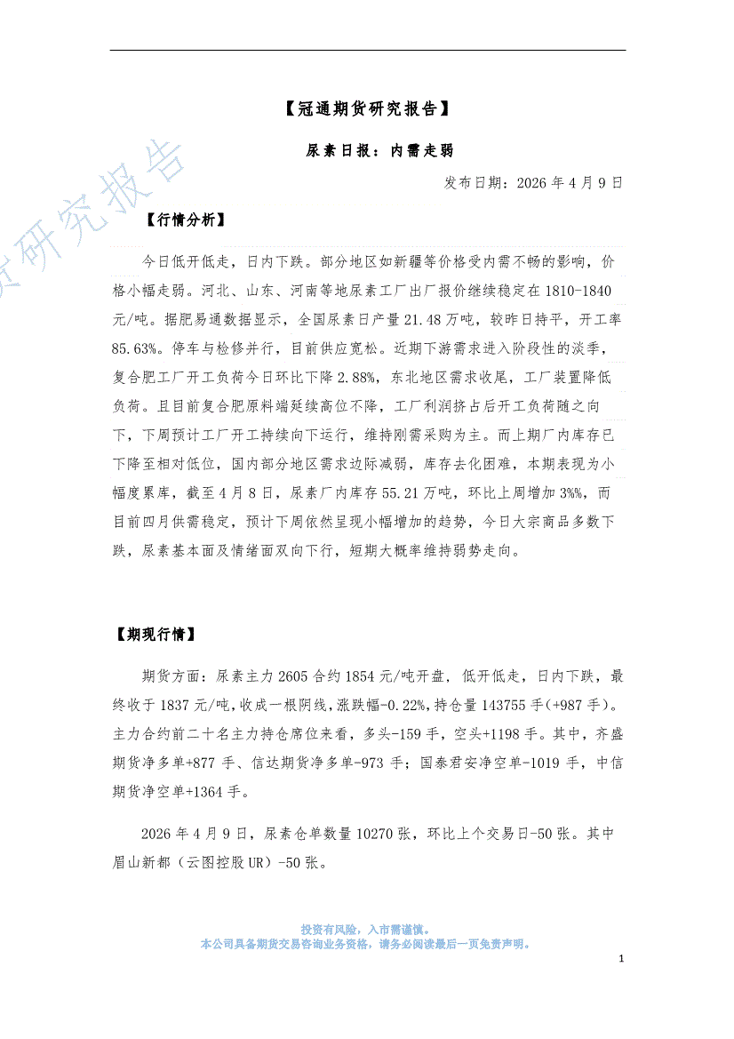 冠通期货-尿素日报:内需走弱-260409