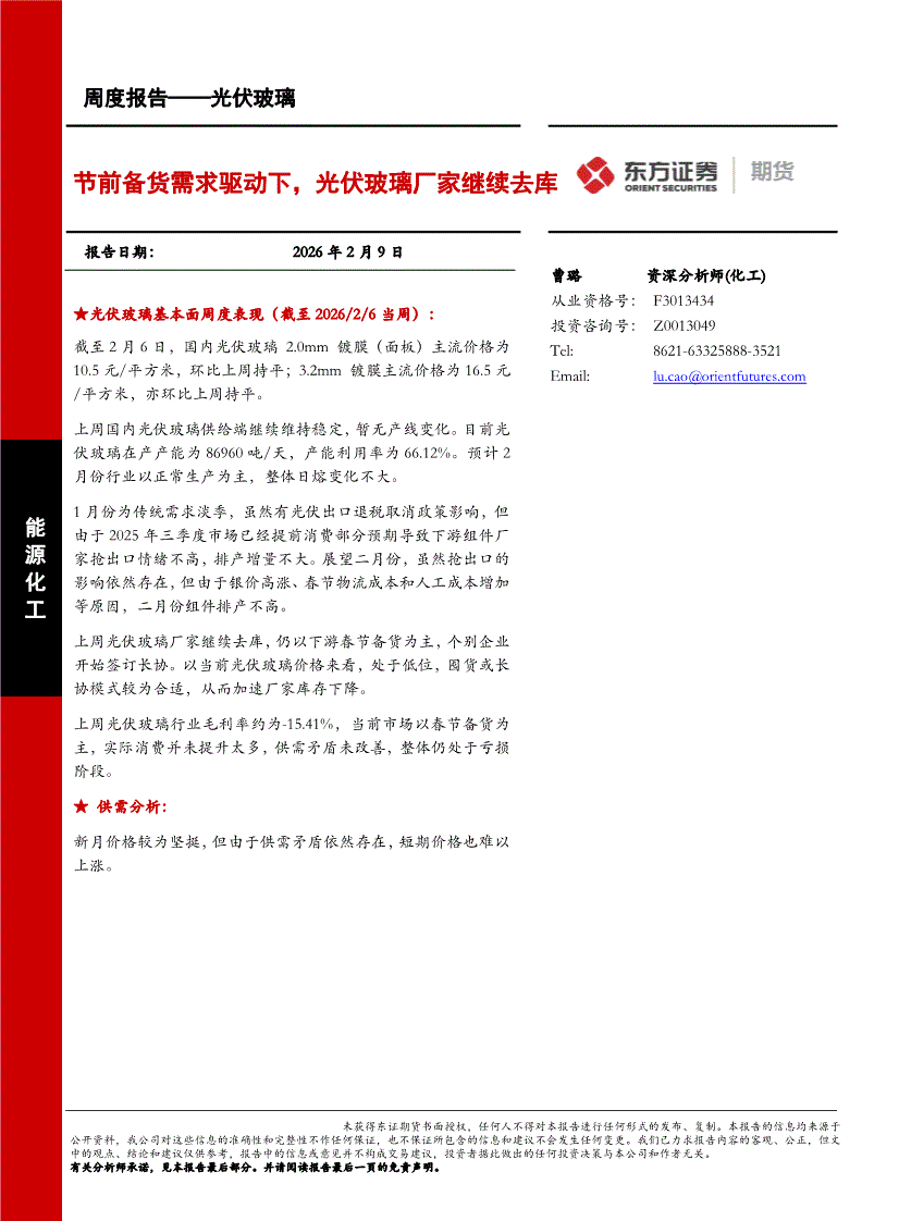 东证期货-光伏玻璃周度报告:节前备货需求驱动下,光伏玻璃厂家继续去库-260209
