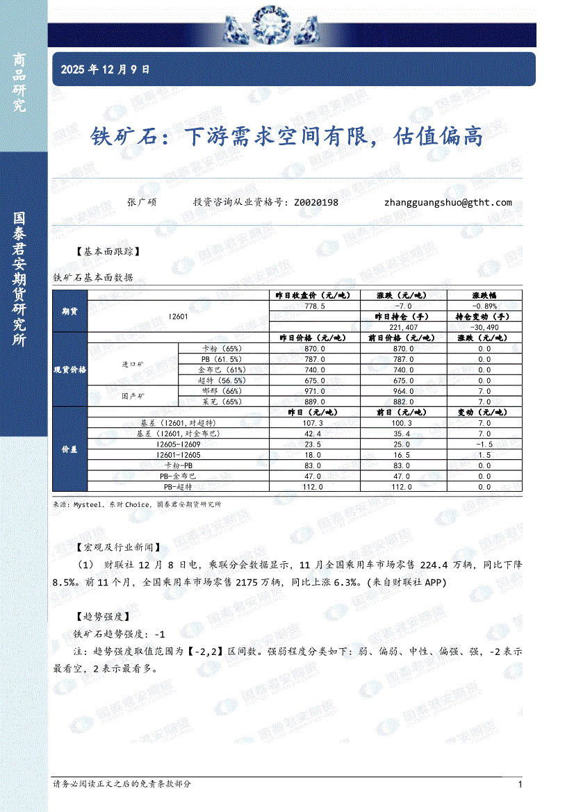 国泰君安期货-铁矿石:下游需求空间有限,估值偏高-251209