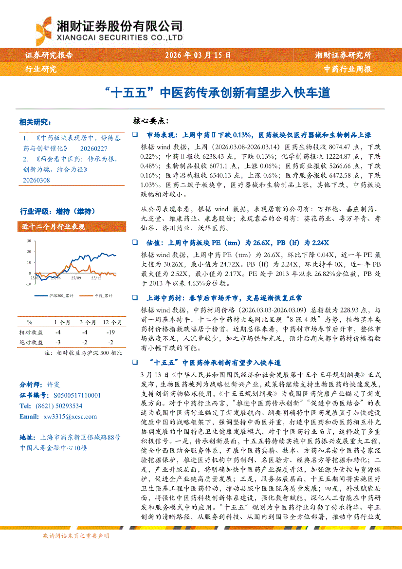 中药行业:湘财证券-中药行业周报:“十五五”中医药传承创新有望步入快车道-260315