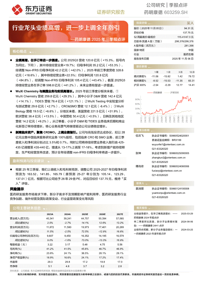 东方证券-药明康德-603259-2025年三季报点评:行业龙头业绩高增,进一步上调全年指引-251106