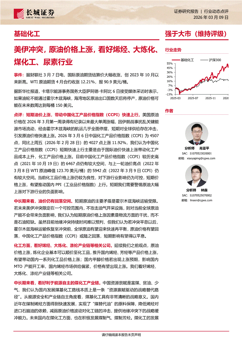 基础化工行业:长城证券-基础化工行业:美伊冲突,原油价格上涨,看好烯烃、大炼化、煤化工、尿素行业-260309