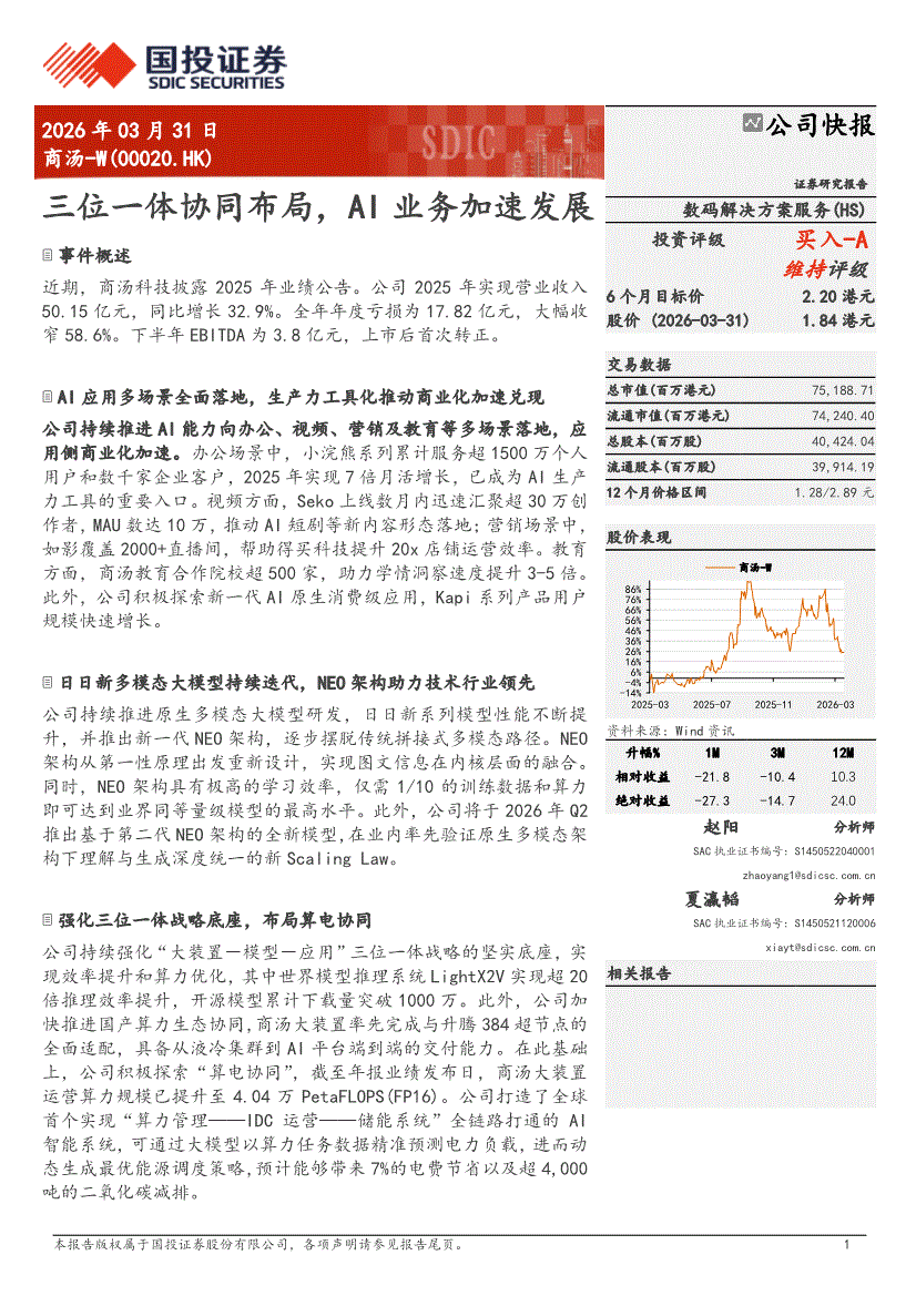 商汤~W:国投证券-商汤~W-0020.HK-三位一体协同布局,AI业务加速发展-260331