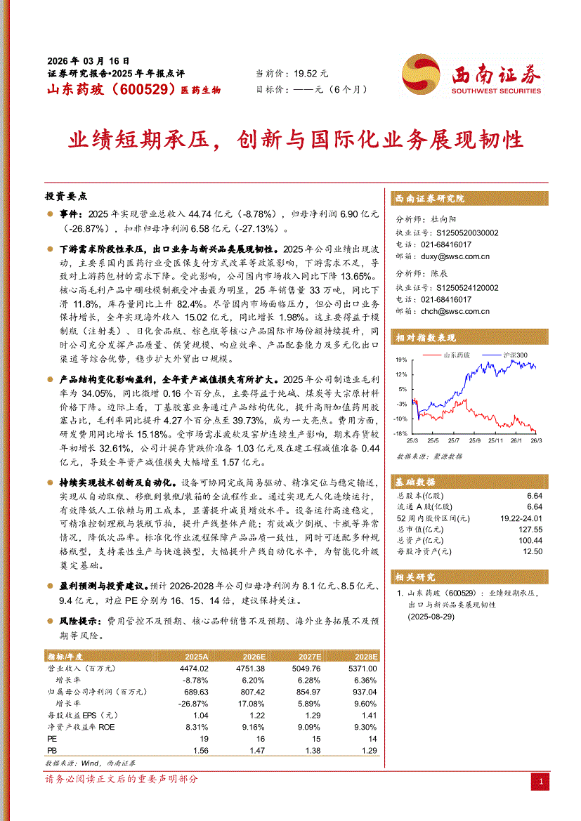 山东药玻:西南证券-山东药玻-600529-业绩短期承压,创新与国际化业务展现韧性-260316