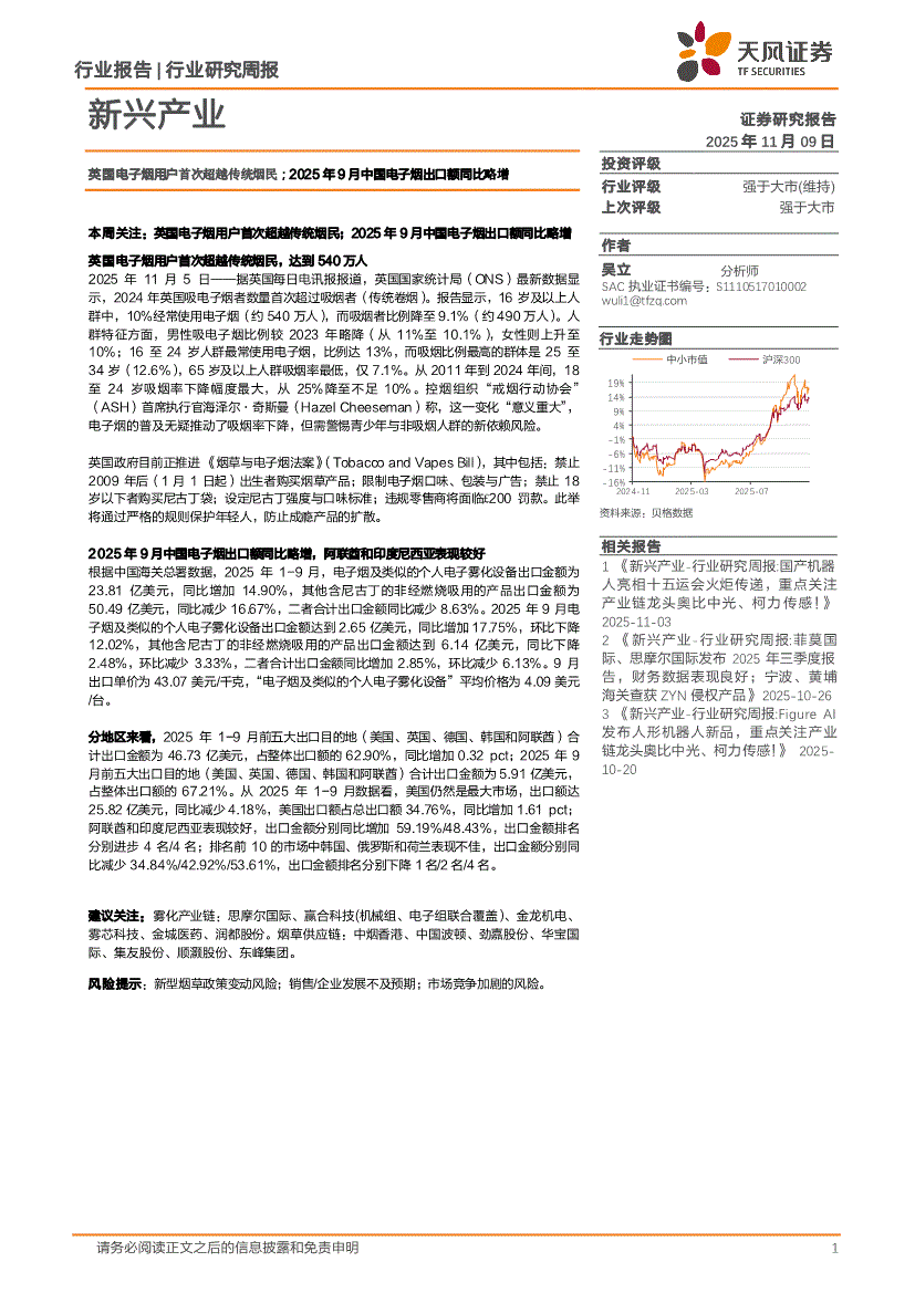 烟草行业:天风证券-烟草行业行业研究周报:新兴产业,英国电子烟用户首次超越传统烟民;2025年9月中国电子烟出口额同比略增-251109