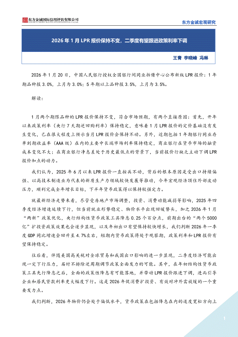 东方金诚-2026年1月LPR报价保持不变,二季度有望跟进政策利率下调-260120