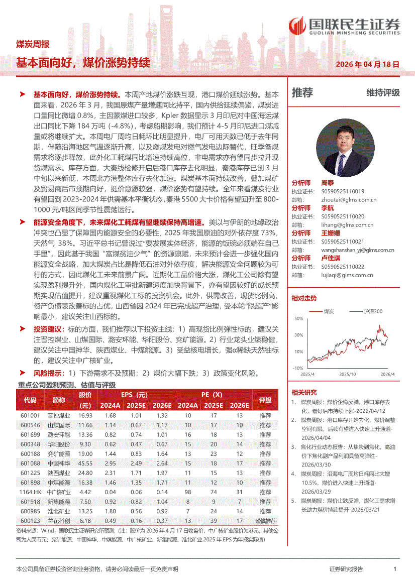 煤炭行业:国联民生证券-煤炭行业周报:基本面向好,煤价涨势持续-260418