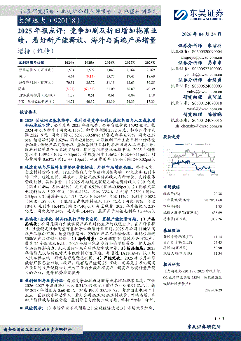太湖远大:东吴证券-太湖远大-920118-2025年报点评:竞争加剧及折旧增加拖累业绩,看好新产能释放、海外与高端产品增量-260424