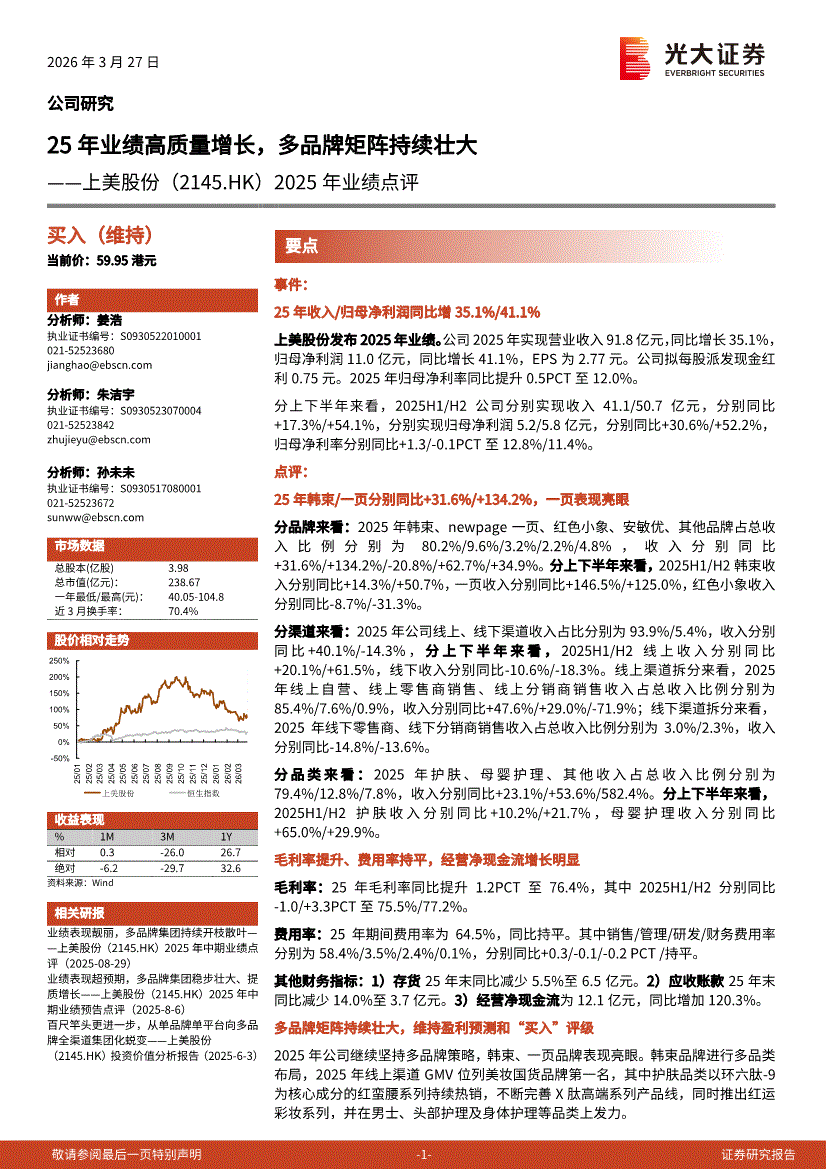 上美股份:光大证券-上美股份-2145.HK-2025年业绩点评:25年业绩高质量增长,多品牌矩阵持续壮大-260327