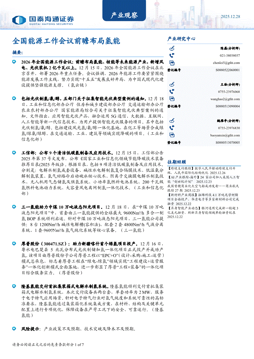 国泰海通证券-产业观察:全国能源工作会议前瞻布局氢能-251228