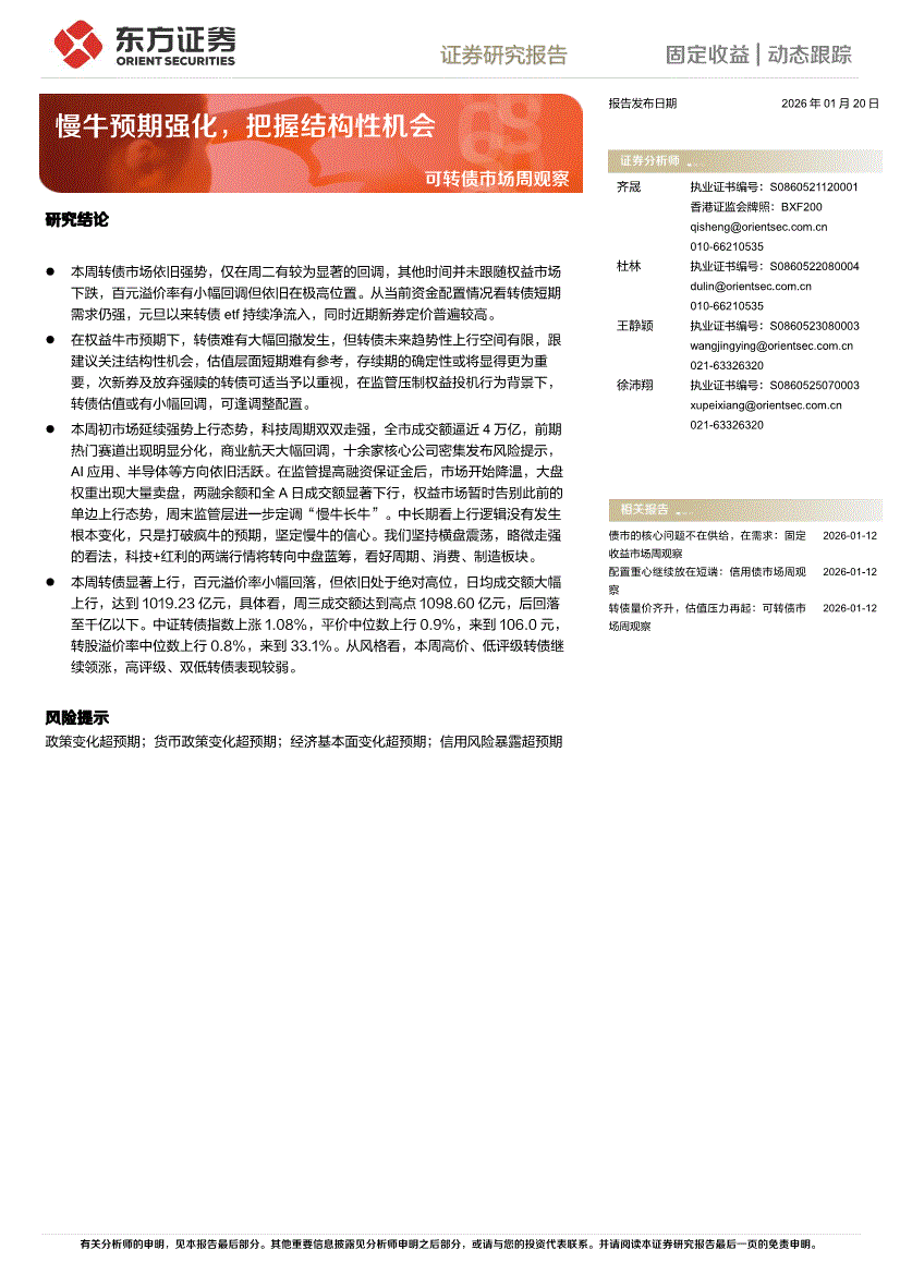 东方证券-可转债市场周观察:慢牛预期强化,把握结构性机会-260120