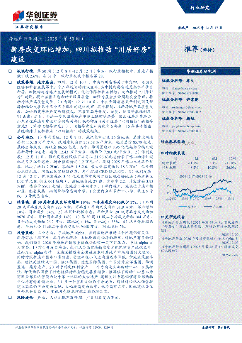 房地产行业:华创证券-房地产行业周报(2025年第50周):新房成交环比增加,四川拟推动“川居好房”建设-251217