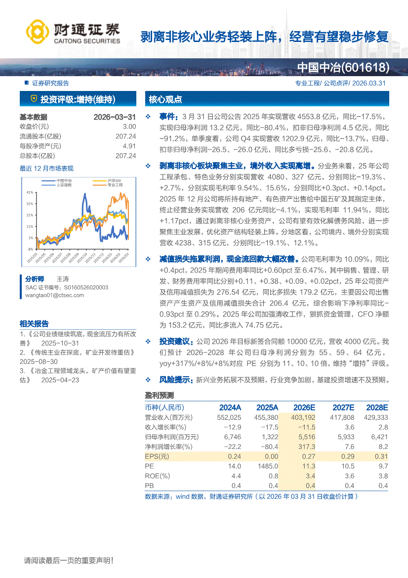 中国中冶:财通证券-中国中冶-601618-剥离非核心业务轻装上阵,经营有望稳步修复-260331
