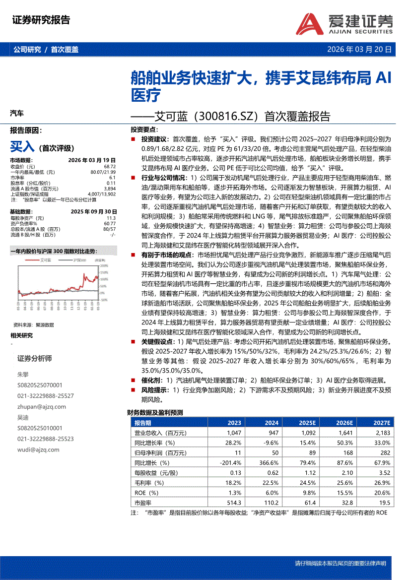 艾可蓝:爱建证券-艾可蓝-300816-首次覆盖报告:船舶业务快速扩大,携手艾昆纬布局AI医疗-260320