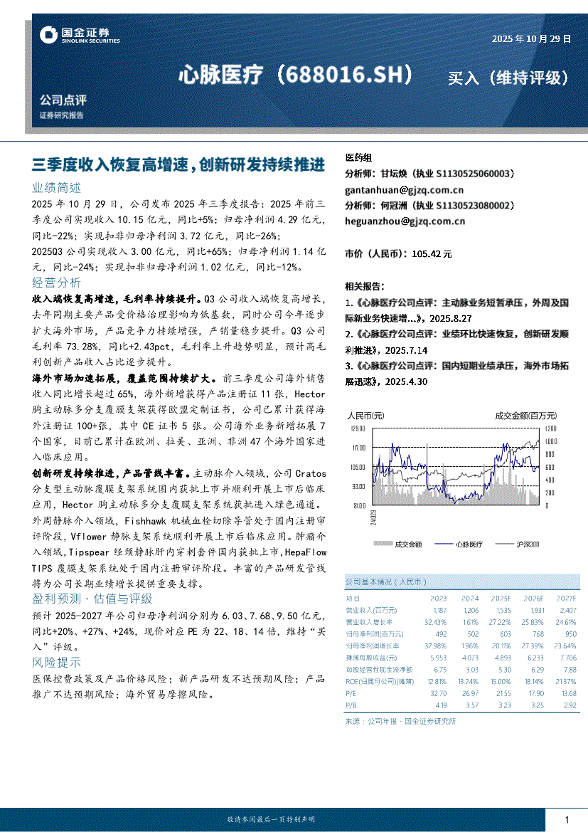 心脉医疗:国金证券-心脉医疗-688016-三季度收入恢复高增速,创新研发持续推进-251029