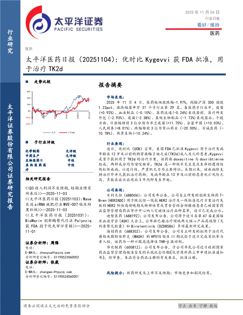 医药行业:太平洋证券-医药行业日报:优时比Kygevvi获FDA批准,用于治疗TK2d-251104