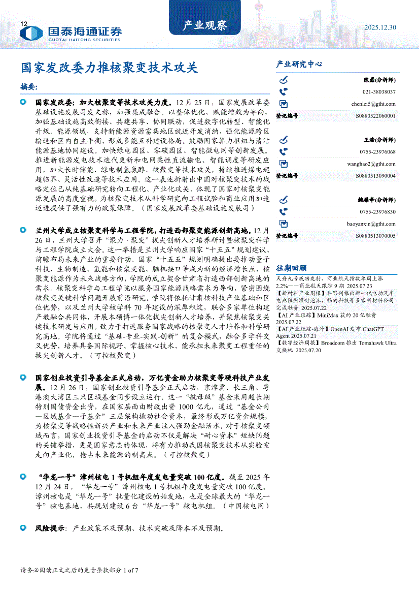 国泰海通证券-产业观察:国家发改委力推核聚变技术攻关-251230