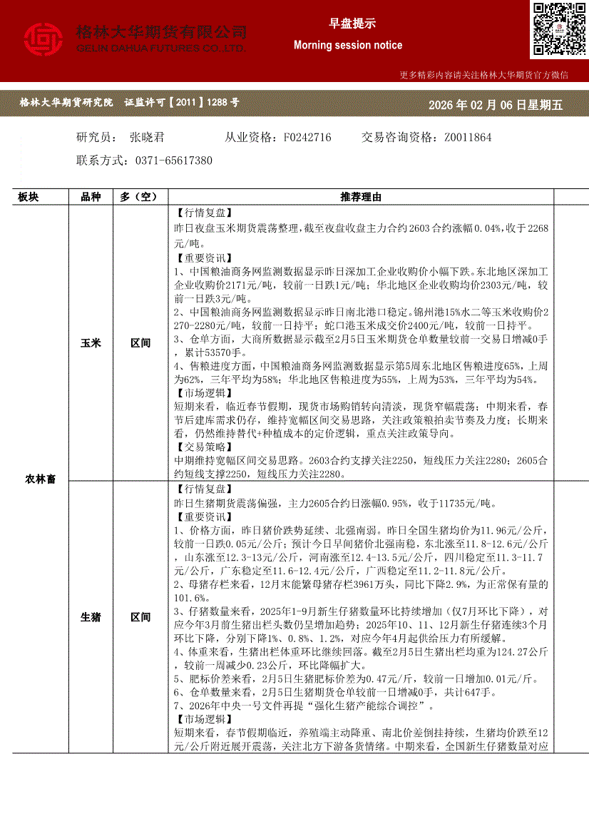 格林大华期货-早盘提示:玉米、生猪、鸡蛋-260206
