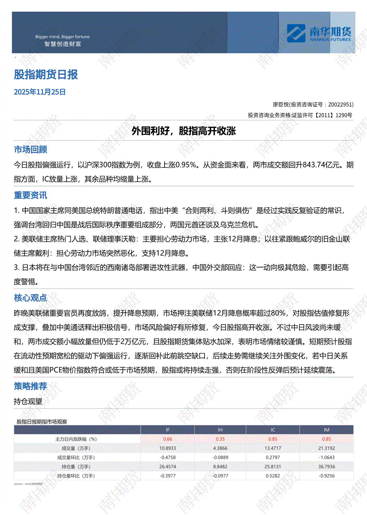 南华期货-股指期货日报:外围利好,股指高开收涨-251125