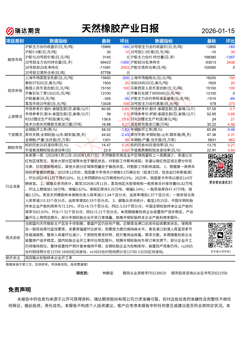 瑞达期货-天然橡胶产业日报-260115