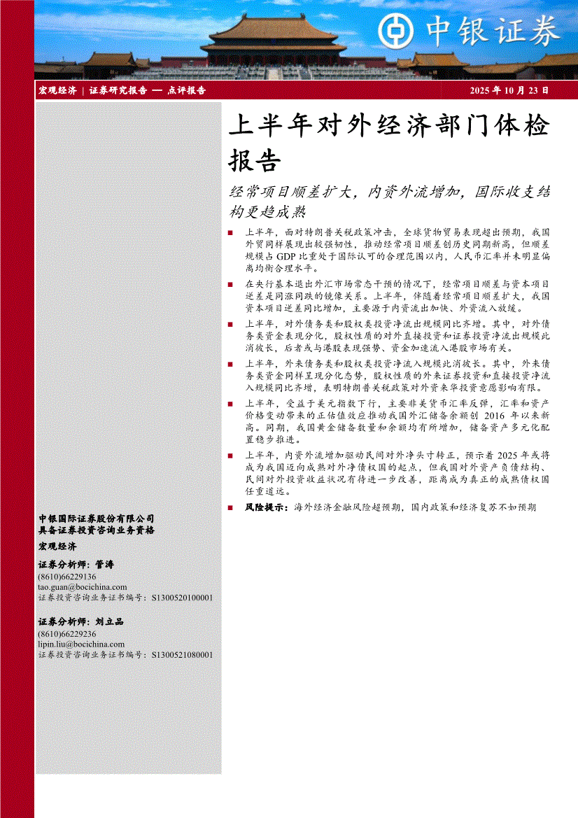 中银国际-上半年对外经济部门体检报告:经常项目顺差扩大,内资外流增加,国际收支结构更趋成熟-251023