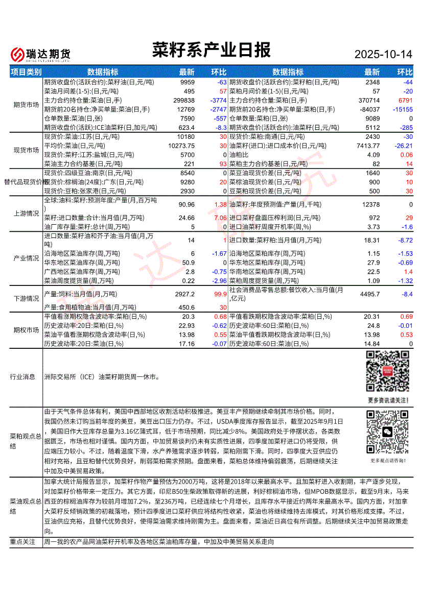 瑞达期货-菜籽系产业日报-251014