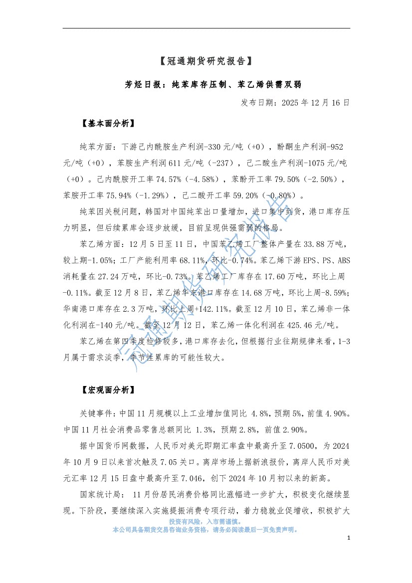 冠通期货-芳烃日报:纯苯库存压制、苯乙烯供需双弱-251216