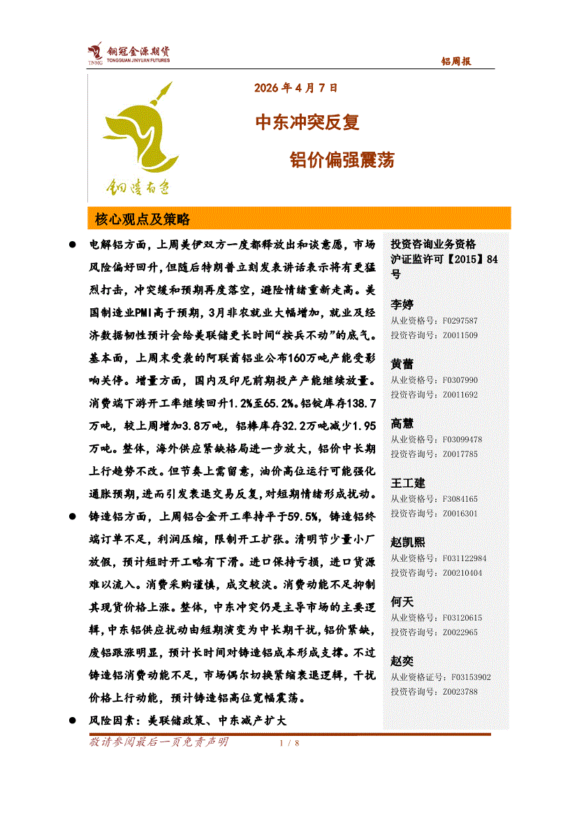 铜冠金源期货-铝周报:中东冲突反复,铝价偏强震荡-260407