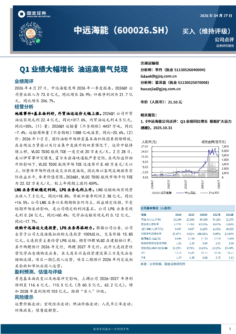 中远海能:国金证券-中远海能-600026-Q1业绩大幅增长,油运高景气兑现-260427