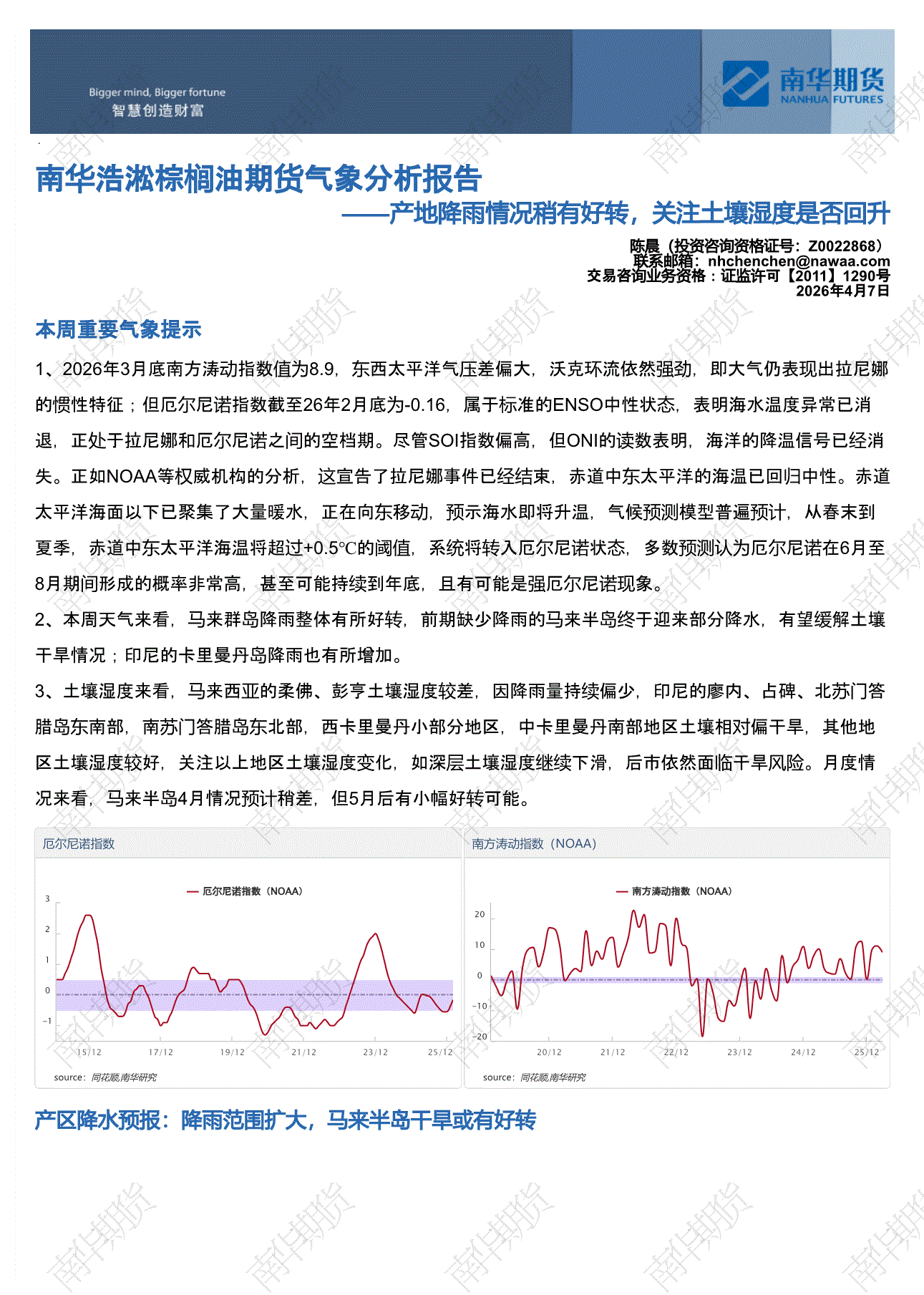 南华期货-浩淞棕榈油期货气象分析报告:产地降雨情况稍有好转,关注土壤湿度是否回升-260407