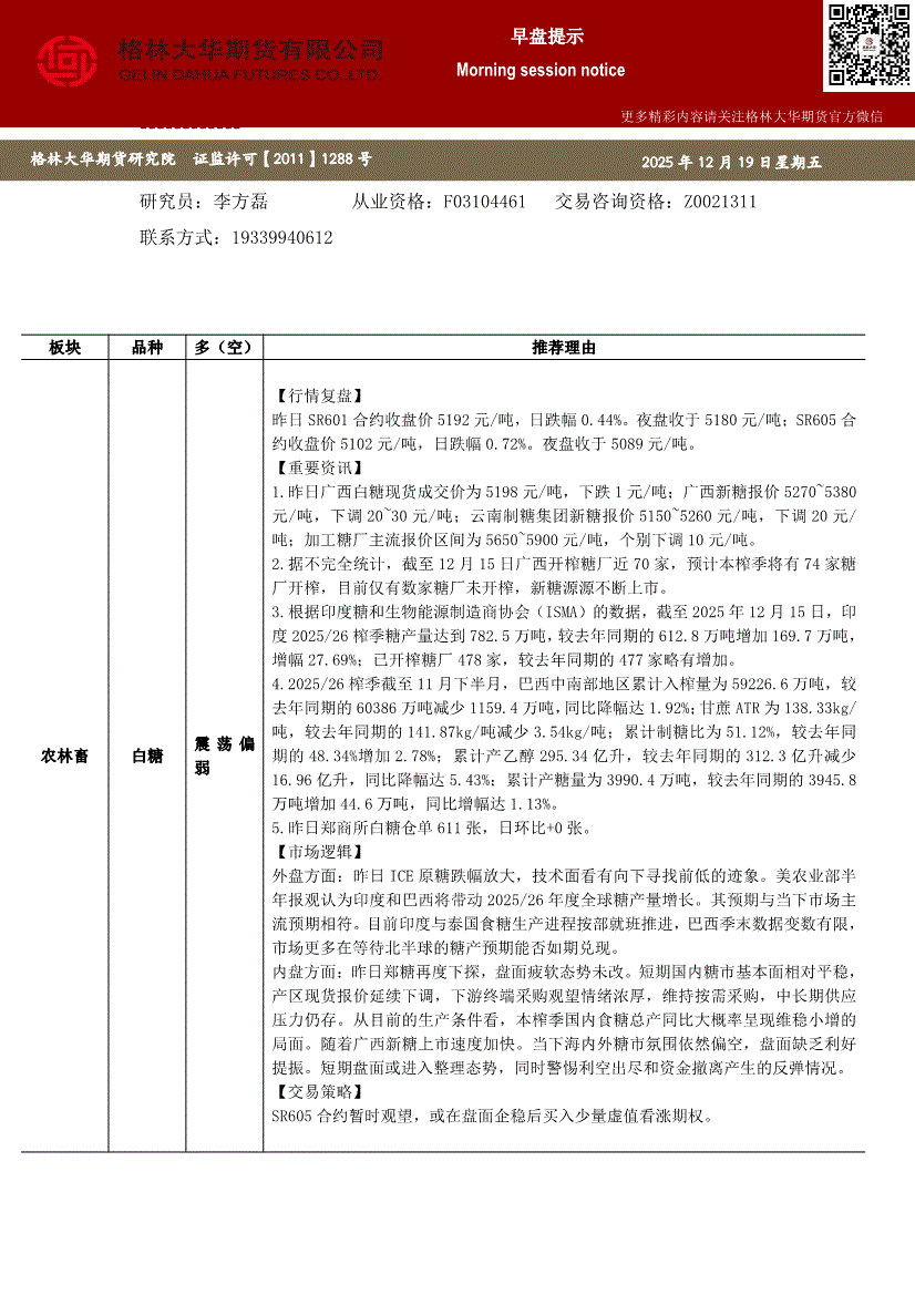 格林大华期货-早盘提示:白糖红枣橡胶-251219