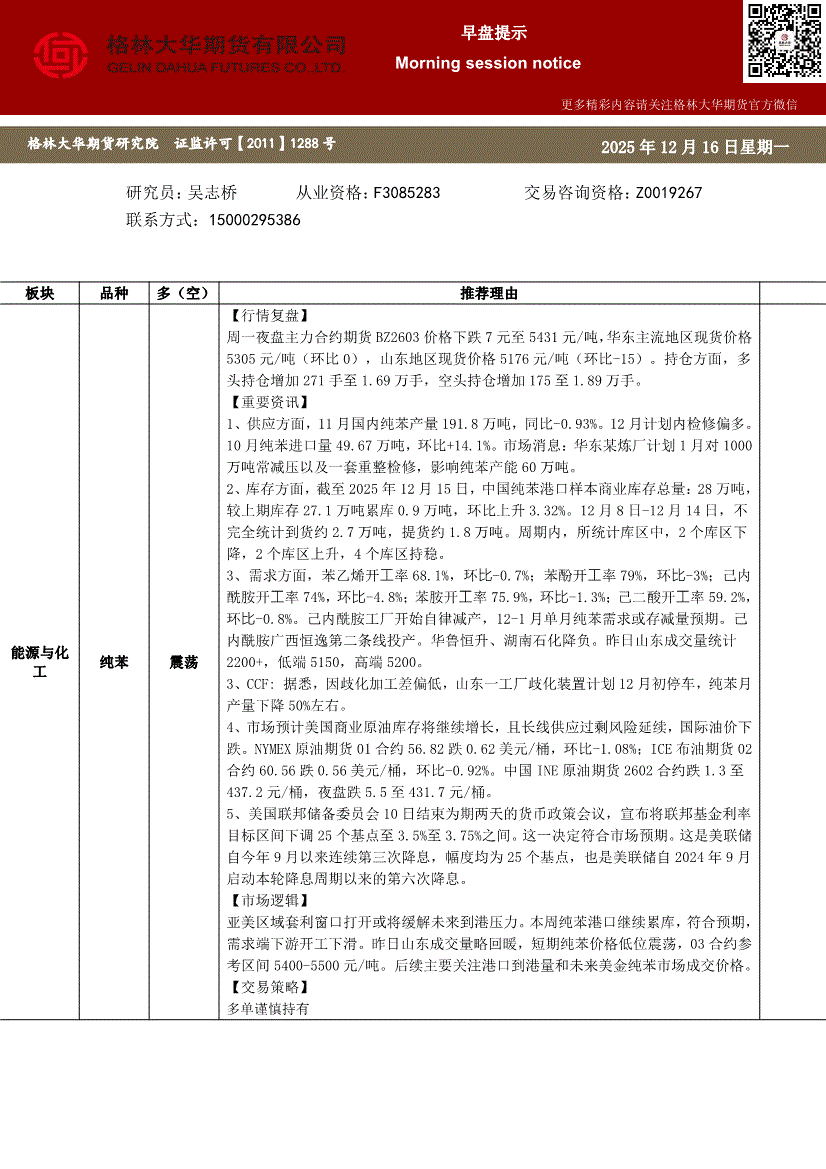 格林大华期货-早盘提示:纯苯-251216