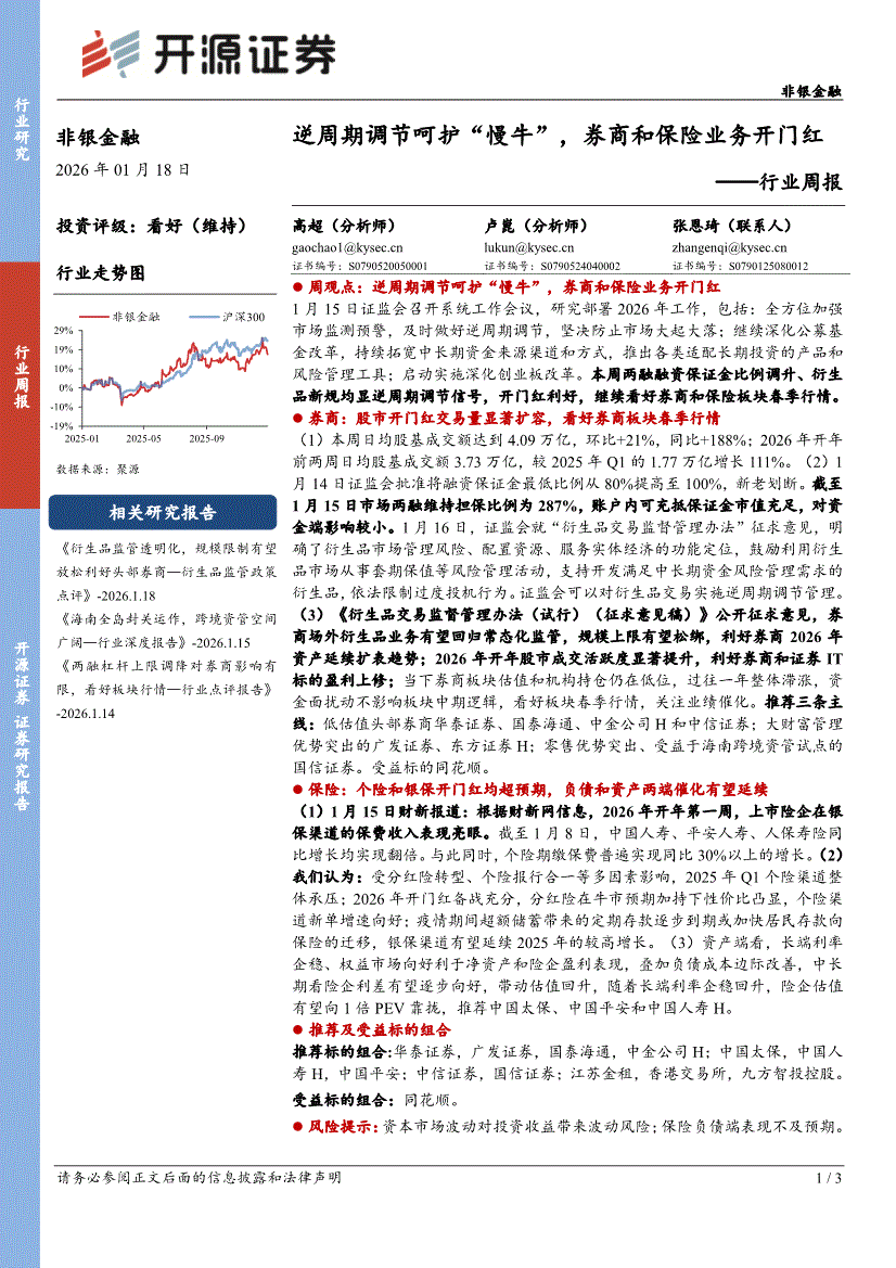 非银金融行业:开源证券-非银金融行业周报:逆周期调节呵护“慢牛”,券商和保险业务开门红-260118