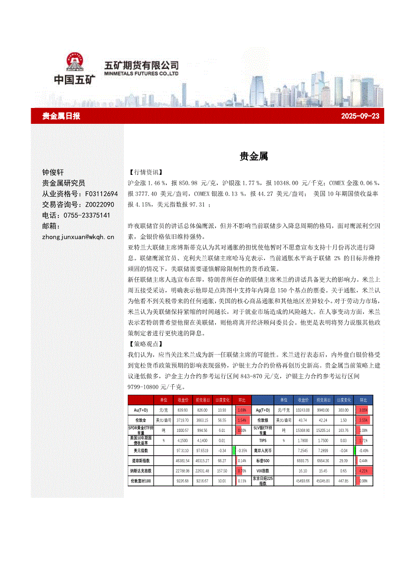 五矿期货-贵金属日报-250923
