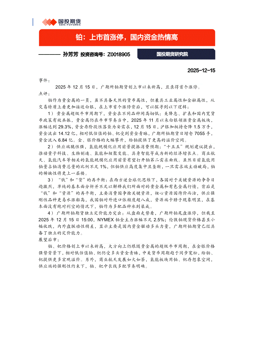 国投期货-铂:上市首涨停,国内资金热情高-251215