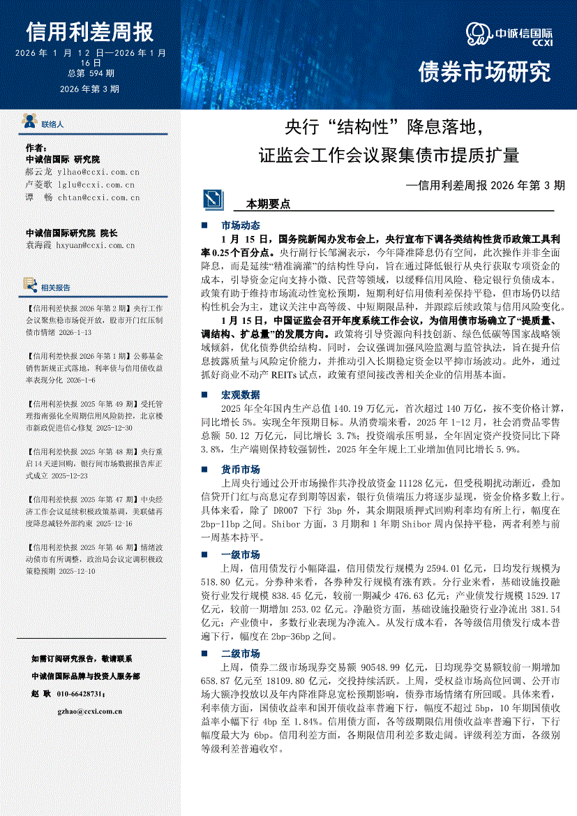 中诚信国际-信用利差周报2026年第3期:央行“结构性”降息落地,证监会工作会议聚集债市提质扩量-260116