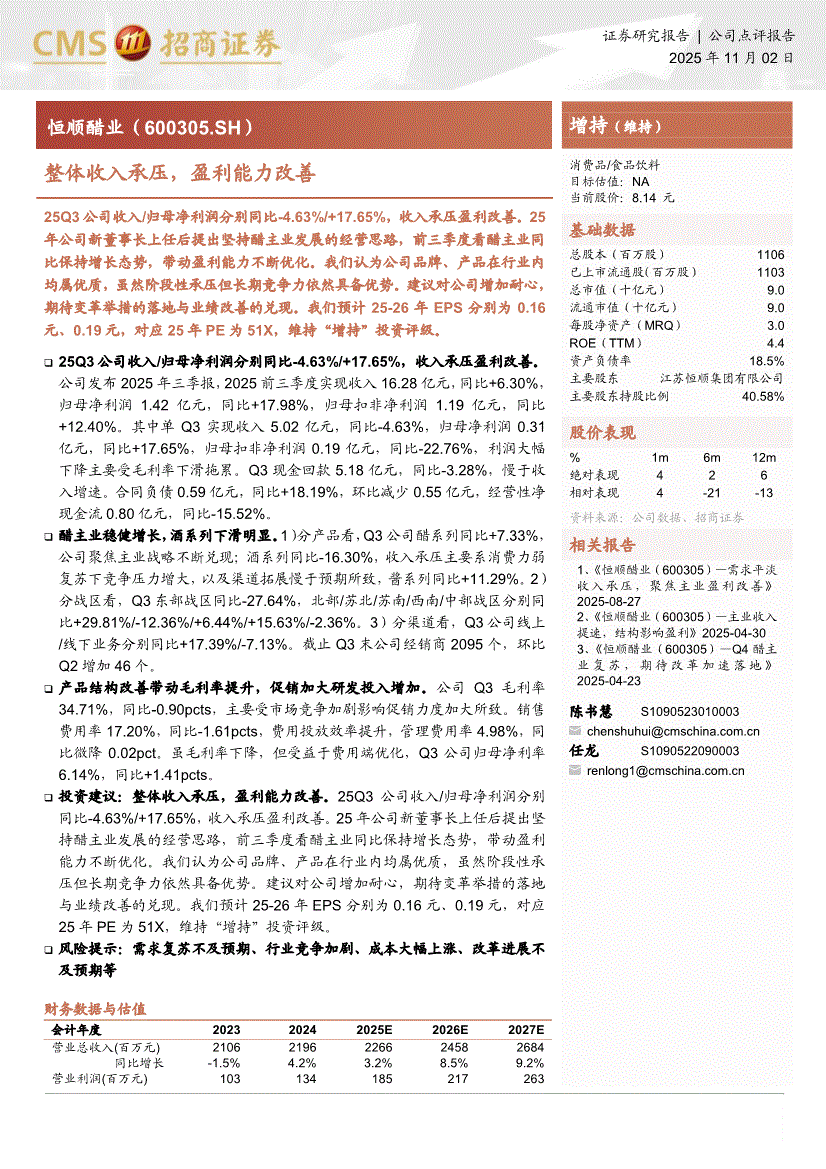 恒顺醋业:招商证券-恒顺醋业-600305-整体收入承压,盈利能力改善-251102