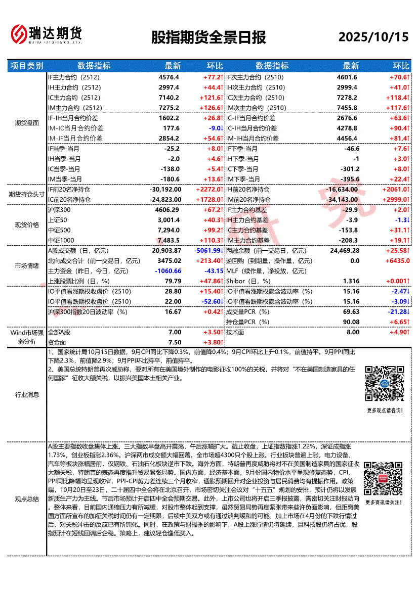 瑞达期货-股指期货全景日报-251015