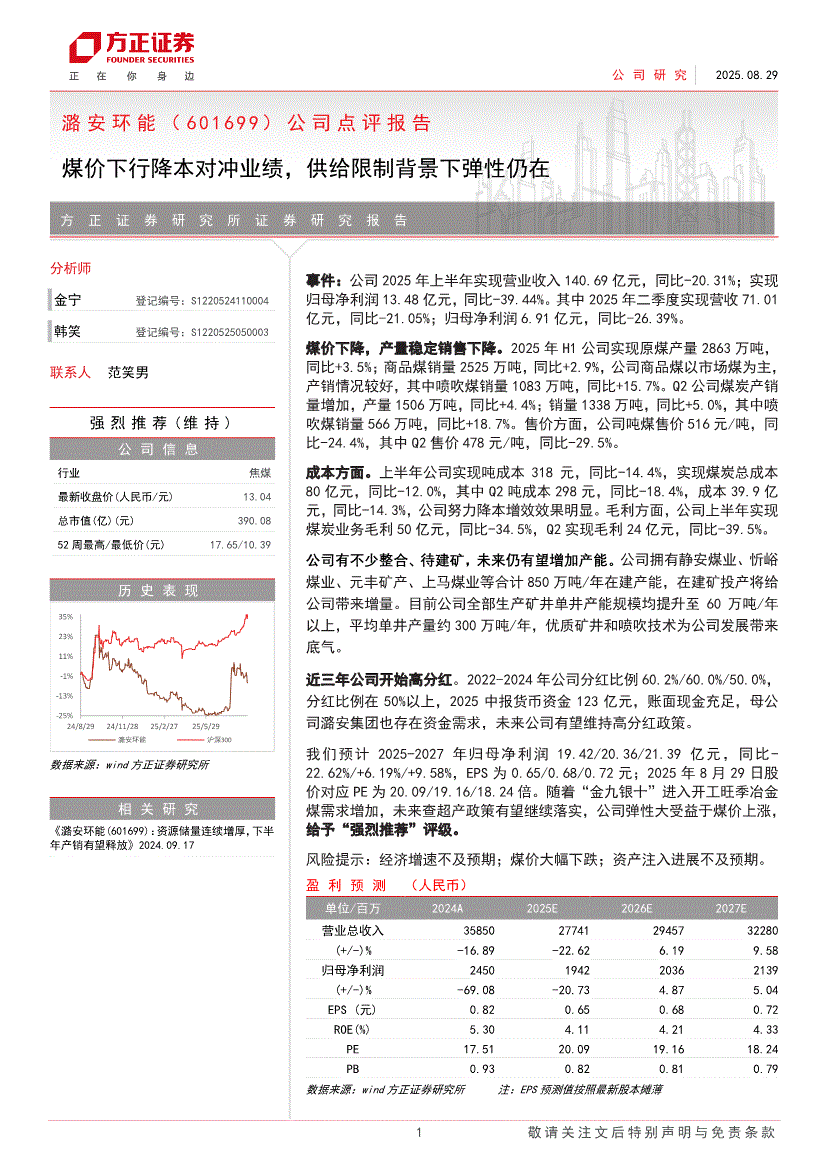 潞安环能:方正证券-潞安环能-601699-公司点评报告:煤价下行降本对冲业绩,供给限制背景下弹性仍在-250829