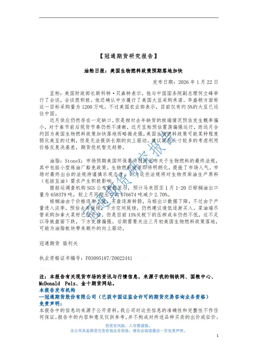 冠通期货-油粕日报:美国生物燃料政策预期落地加快-260122