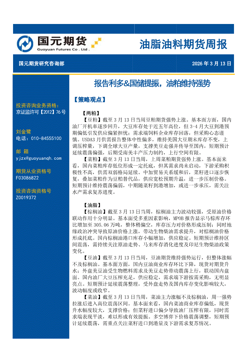 国元期货-油脂油料期货周报:报告利多&国储提振,油粕维持强势-260313