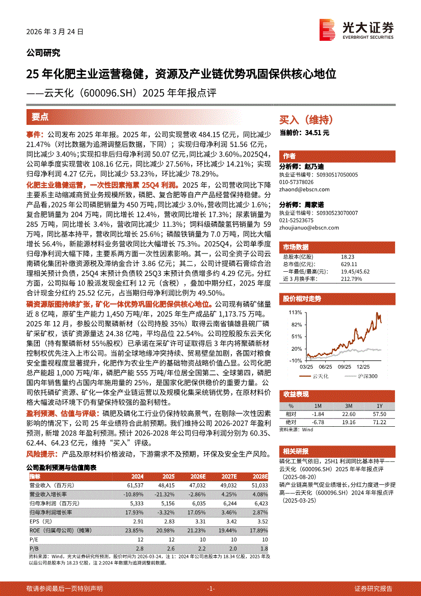 云天化:光大证券-云天化-600096-2025年年报点评:25年化肥主业运营稳健,资源及产业链优势巩固保供核心地位-260324