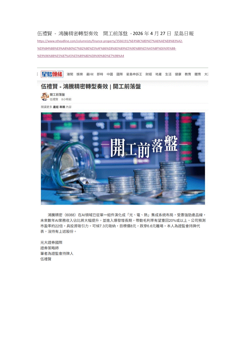 光大证券(国际)-星岛日报:鸿腾精密转型奏效,开工前落盘-260427